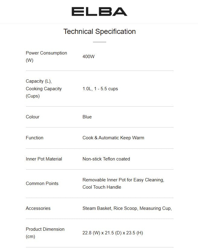 Elba 1.0L Jar Rice Cooker ERC-R1037(BL) / ERCR1037BL