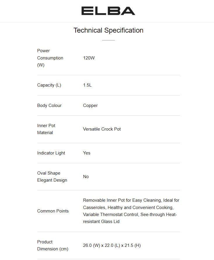 ELBA 1.5L Slow Cooker ESC-K1568(CP) / ESCK1568CP