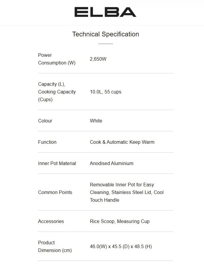 Elba 10L Rice Cooker ECRC-M1026(WH) / ECRCM1026
