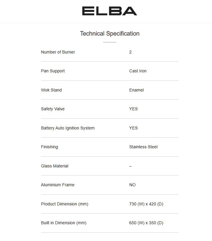 Elba 2 Burners Built-In Glass Hob Cast Iron Support EBH-M8962(SS) / EBHM8962SS