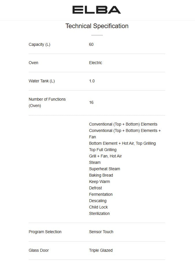 Elba 60L Built in steam convection and grill oven ESGO-N6088D(BK) / ESGON6088DBK