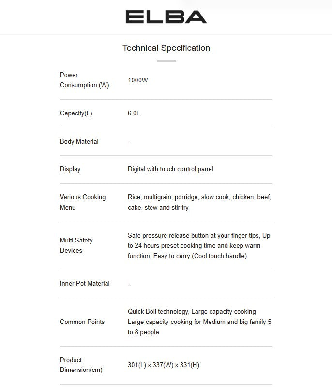 Elba 6L Pressure Cooker 1000W EPC-N6082(BR) / EPCN6082BR