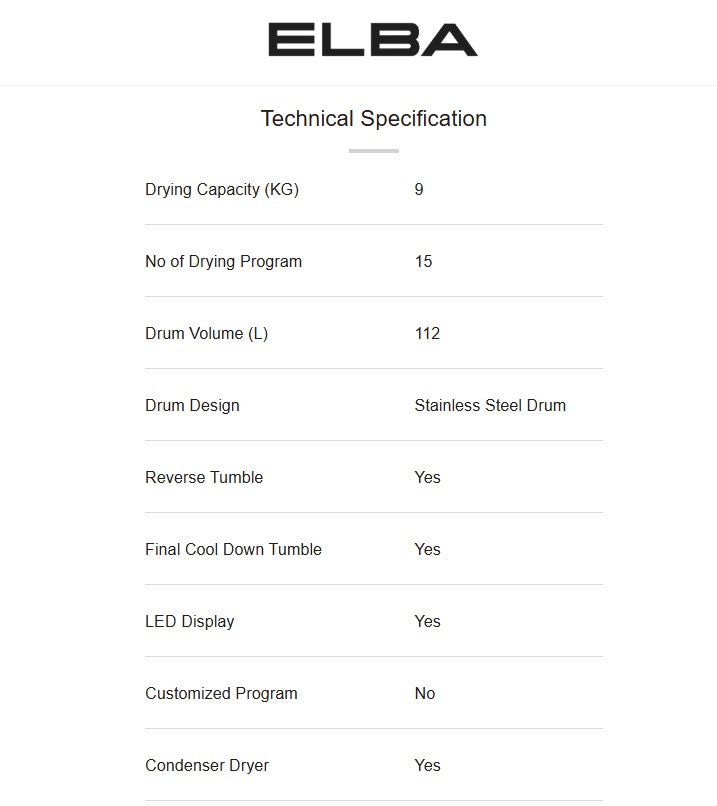 Elba 9KG Condenser Dryer ED-H9151C(WH) 15 Drying Program EDH9151CWH