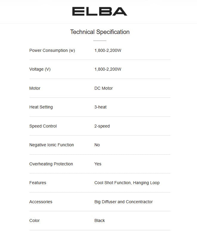 Elba Hair Dryer 2speeds Control, 3 Heat Settings - Black (1800W-2000W) EHD-G2037(BK) / EHDG2037BK