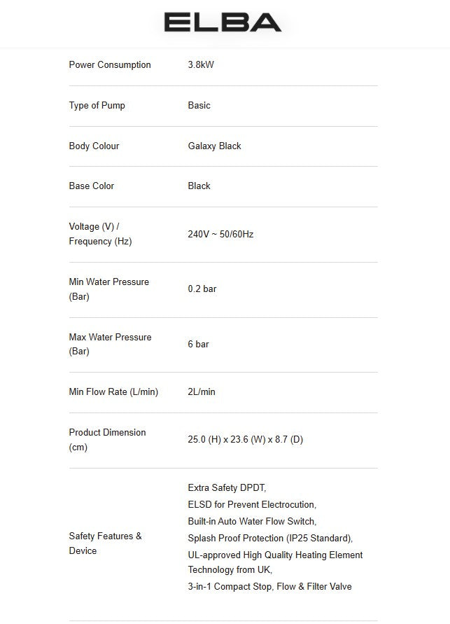 Elba Water Heater No-Pump EWH-K3420(GB) Galaxy Black EWHK3420GB