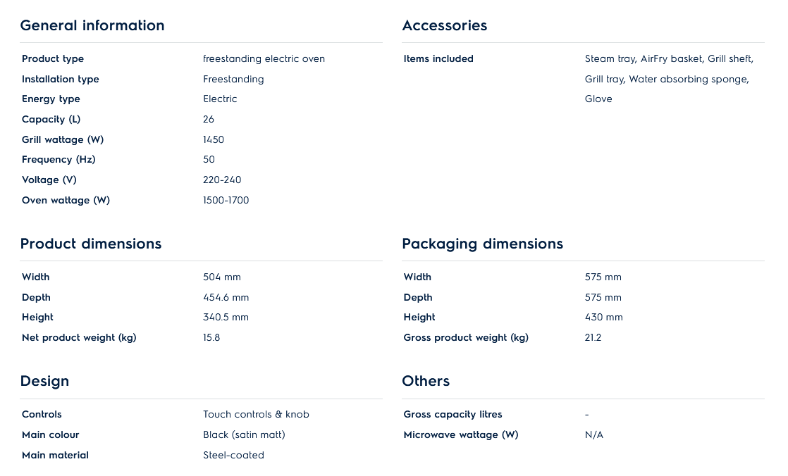 Electrolux EOS26T24BM 50cm UltimateTaste 900 freestanding electric oven with 26L capacity