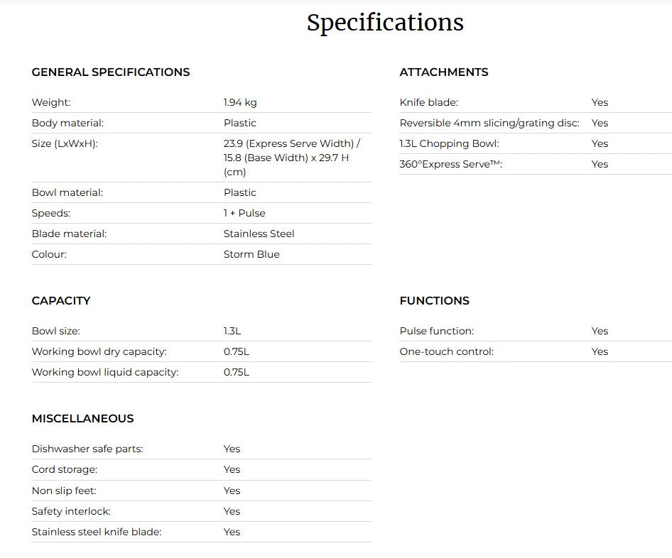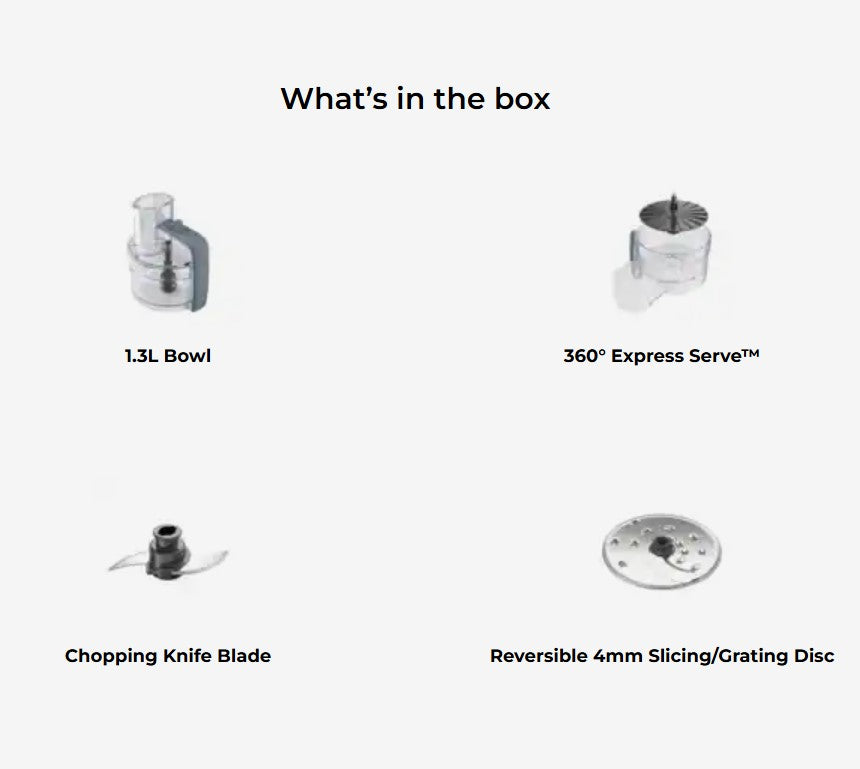 ● Accessories: 1.3L Plastic Bowl, Express Serve, Disc, Stainless steel Blade
