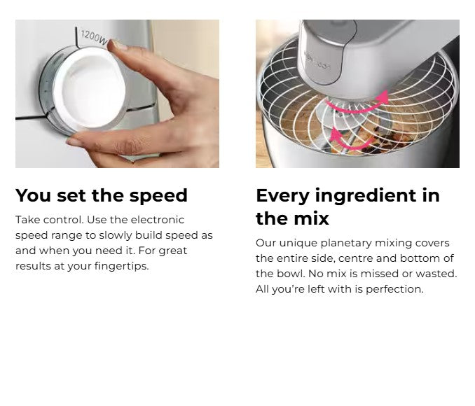 The digitally controlled motor cleverly adjusts to whatever you're making. You'll only ever use the power you need. And with 1200W of power at your fingertips, you’ll make even lighter work of heavy doughs and fruit cake mixes.