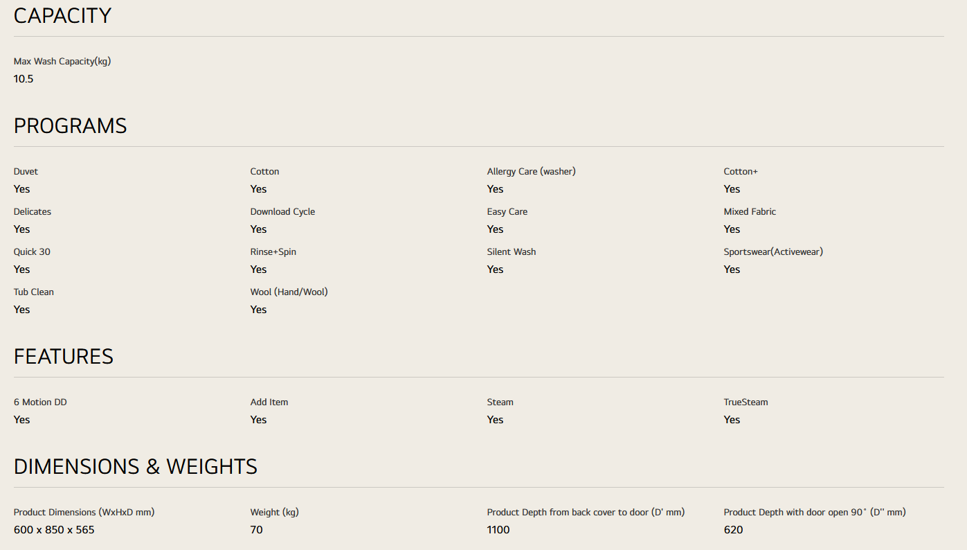 LG FV1450S4W 10.5kg Front Load Washer with AI Direct Drive™ and Steam™