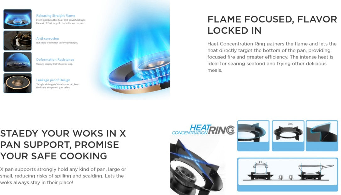 Heat Concentration Ring gathers the flame and lets the heat directly target the bottom of the pan, providing focused fire and greater efficiency. The intense heat is ideal for searing seafood and frying other delicious meals.