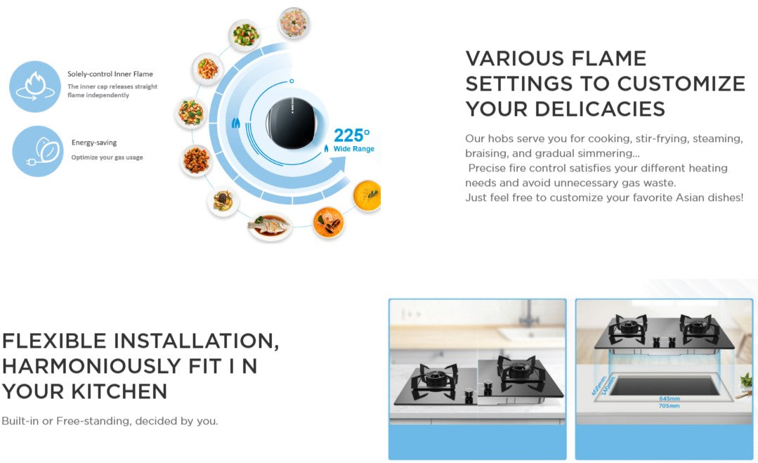 Our hobs serve you for cooking, stir-frying, steaming, braising, and gradual simmering… Precise fire control satisfies your different heating needs and avoid unnecessary gas waste.