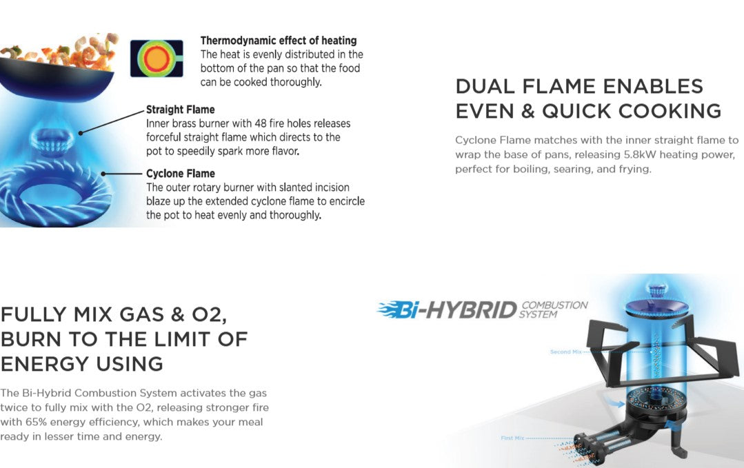 The Bi-Hybrid Combustion System activates the gas twice to fully mix with the O2, releasing stronger fire with 65% energy efficiency, which makes your meal ready in lessen time and energy.