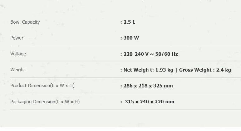 ● With rotary 2.5L plastic bowl