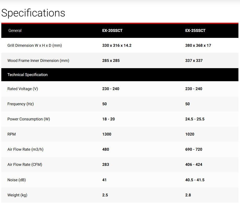 Operates quietly and energy efficient. Equipped with back-draft shutter. Easy slide-type installation and removal. The grille is a snap-fit type that makes cleaning less hassle.