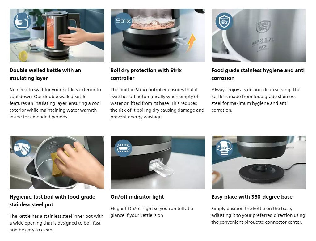 Philips 1.7L HD9395 Double Walled Kettle 5000 Series HD9395/90 (Black)