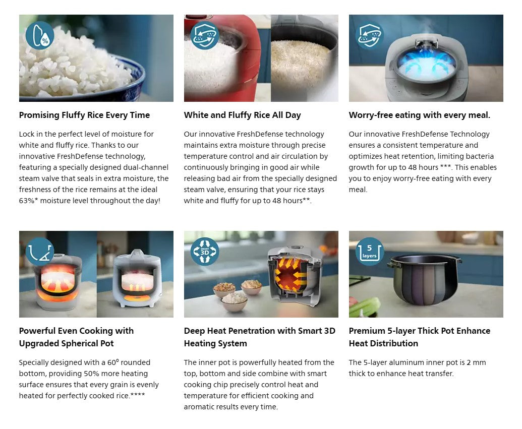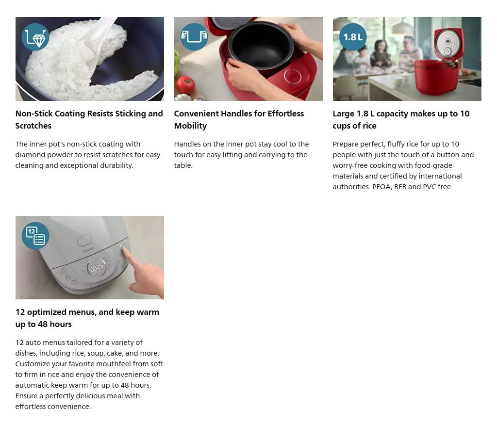 Enjoy perfectly fluffy rice all day long with the Philips Digital Rice Cooker 3000 Series. Ensure the ideal texture of white and fluffy rice for up to 48 hours, explore 12 auto cooking menus for an effortless variety cooking experience!