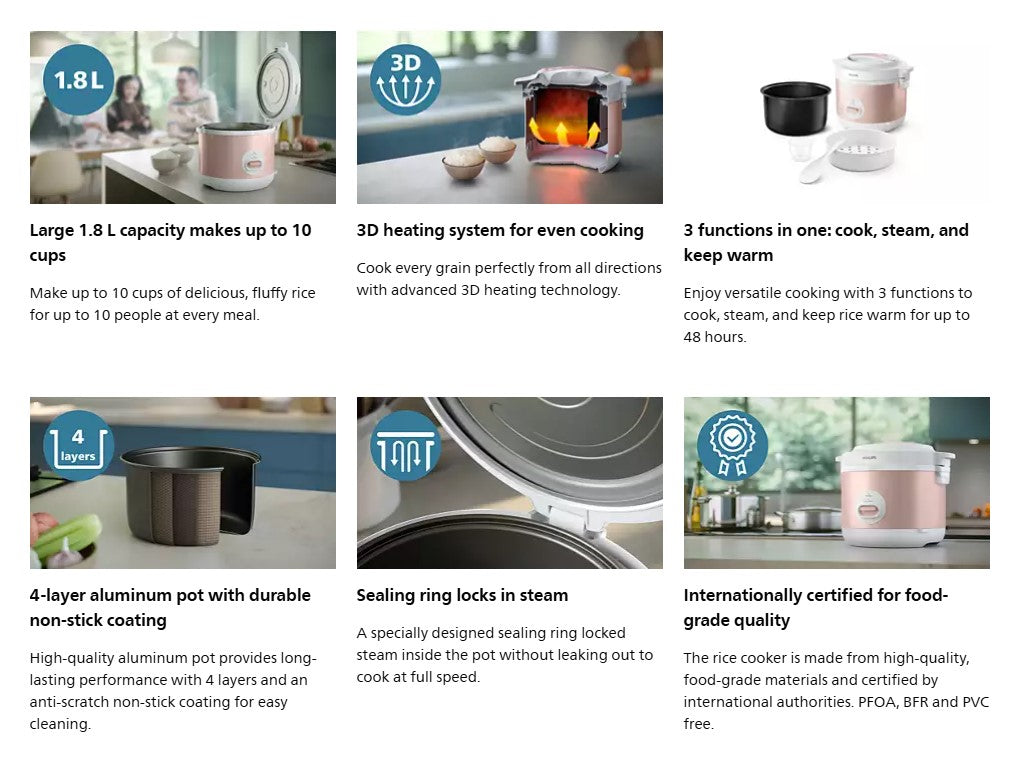 Enjoy reliable effortless daily cooking in Philips 1000 Series Rice Cooker with international certificated quality. Large capacity makes up to 10 servings with 3 functions. For durable, long-lasting performance at the touch of a button.