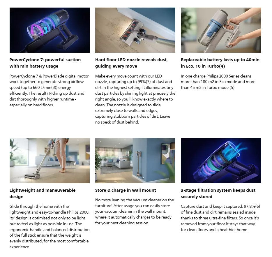 Enjoy easy cleaning with the maneuverable Philips 2000 series. It offers powerful suction on hard floors thanks to its PowerCyclone technology, and illuminates hidden dust with the LED Nozzle.