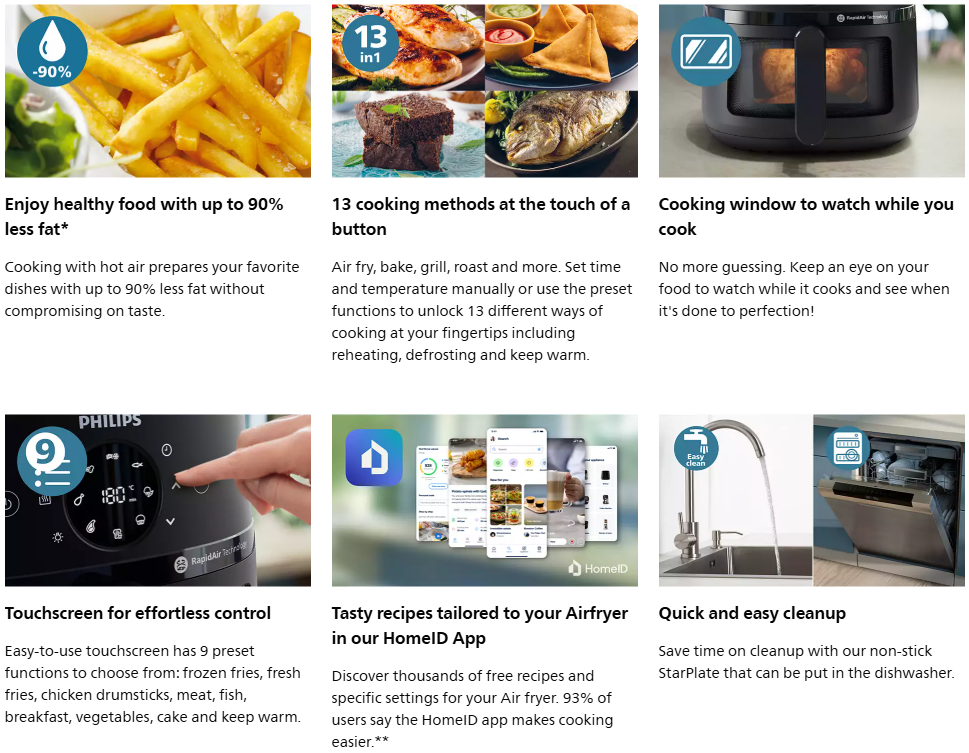 Crispy outside, tender inside. Unique Rapid Air technology saves time and energy, without compromising on taste. Watch through the cooking window while your favorite ingredients turn into delicious food in under 15 minutes.