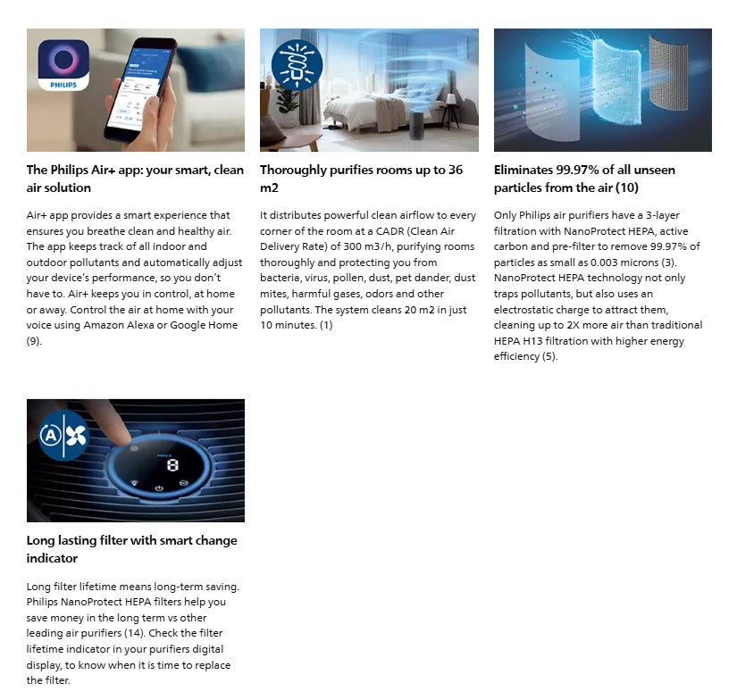 Philips Air Purifier 1000i series effectively and quickly removes pollutants, PM2.5, allergens and viruses to keep it clean and safe. Monitor the air quality with real-time feedback and control your air purifier anytime, anywhere with the Philips Air+ app.