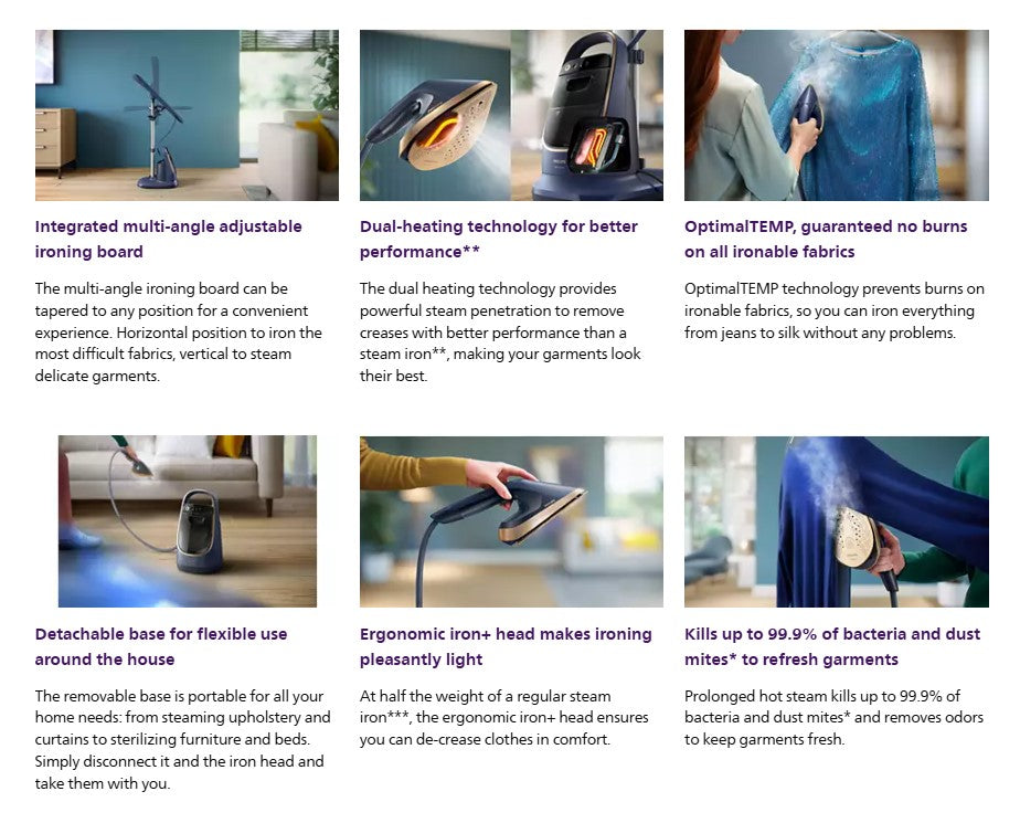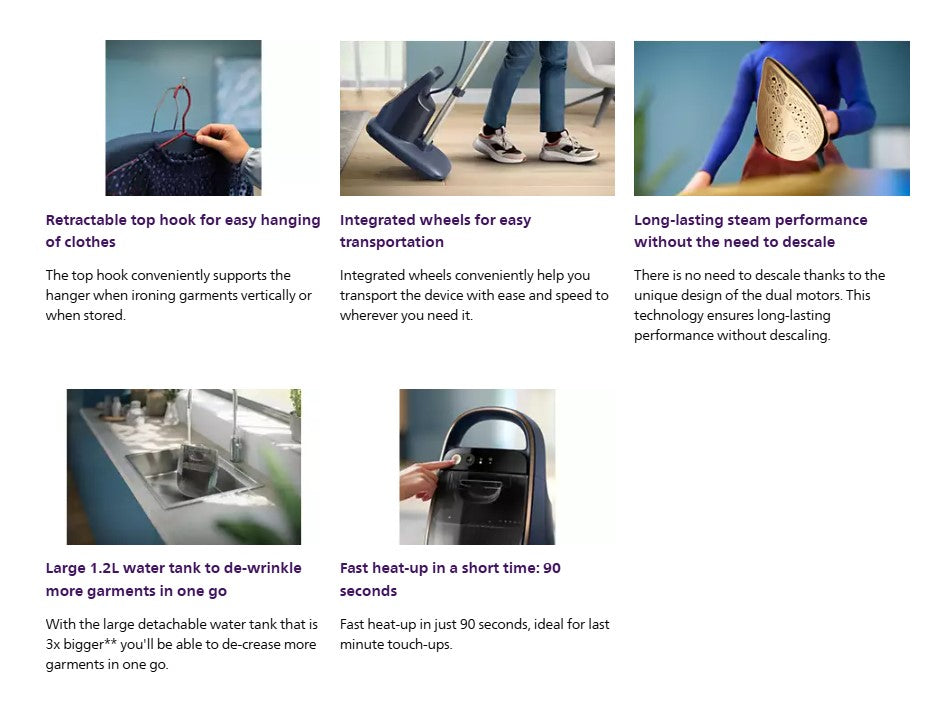 The Philips All-in-One 8500 Series is the game-changing solution to look your best. The steaming and ironing combination is a convenient mix of easy handling and powerful performance.