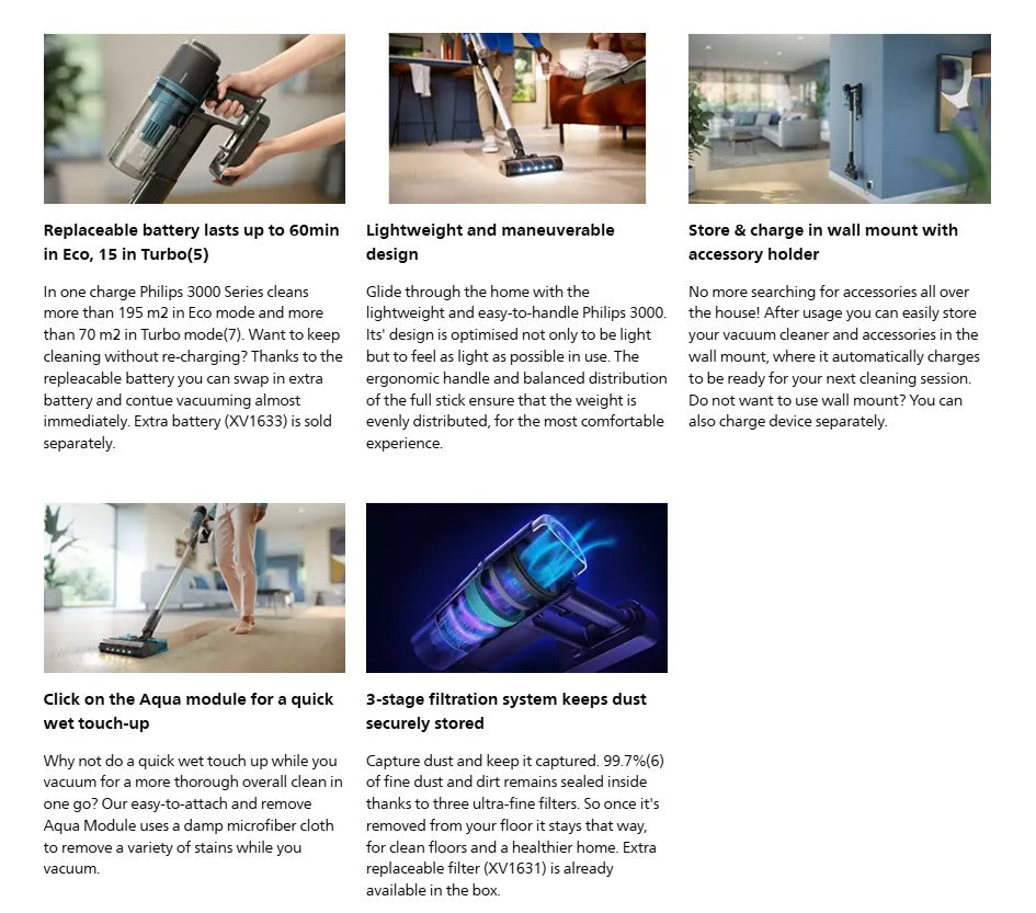 Cleaning is a breeze with the lightweight Philips 3000 series. It offers powerful suction on hard floors thanks to its PowerCyclone* technology, and illuminates hidden dust with the LED Nozzle. Cleaning with a quick wet touch awaits!