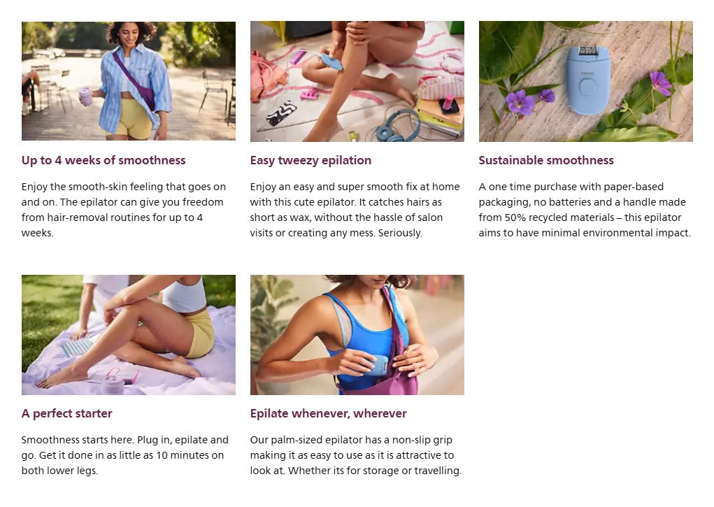 Explore lasting hair removal that is kind to your skin and say hello to smoothness for up to 28 days. We get it, epilation can be scary. But it gets less painful with regular use!*