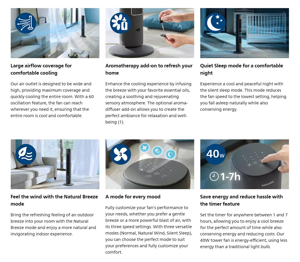 Enjoy powerful cooling with minimal noise and energy usage. Designed for high performance, this self-rotating fan brings a quick cooling effect to the entire room. Optionally, it can also infuse the air with your favorite scents.