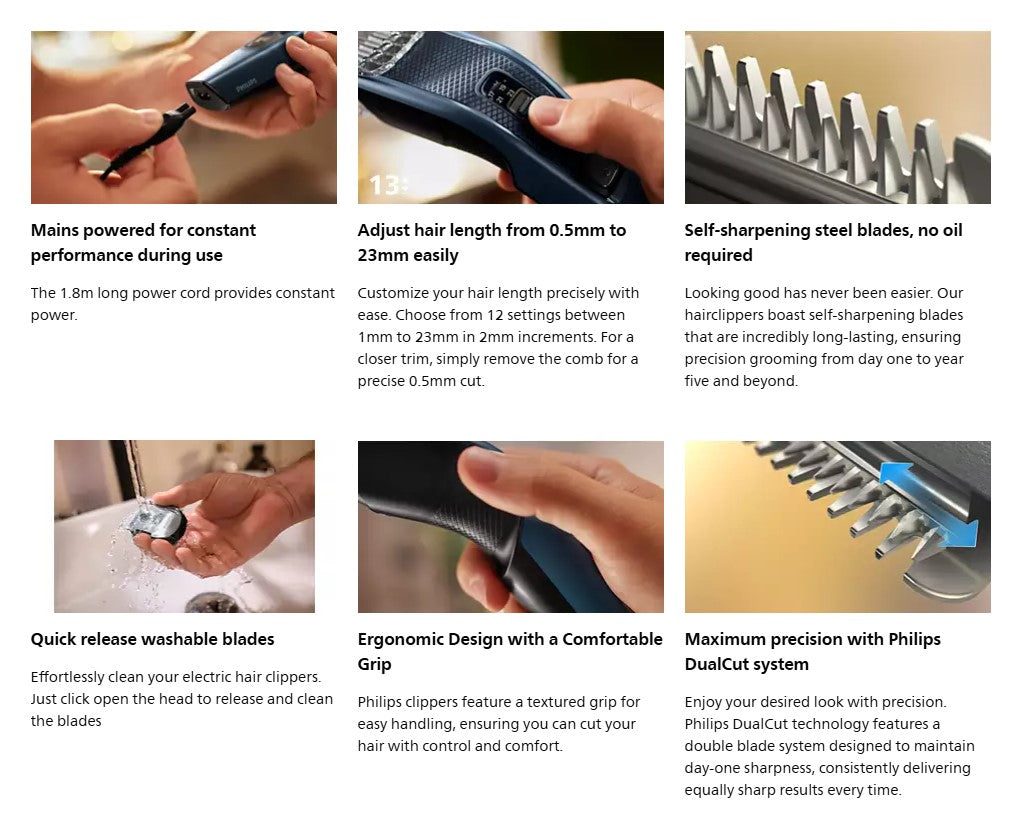 The Hair Clipper 3000 by Philips gives you a fast, even haircut. The device's 13 length settings, Trim-and-Flow technology, and DualCut technology lets you quickly acheive an even finish.