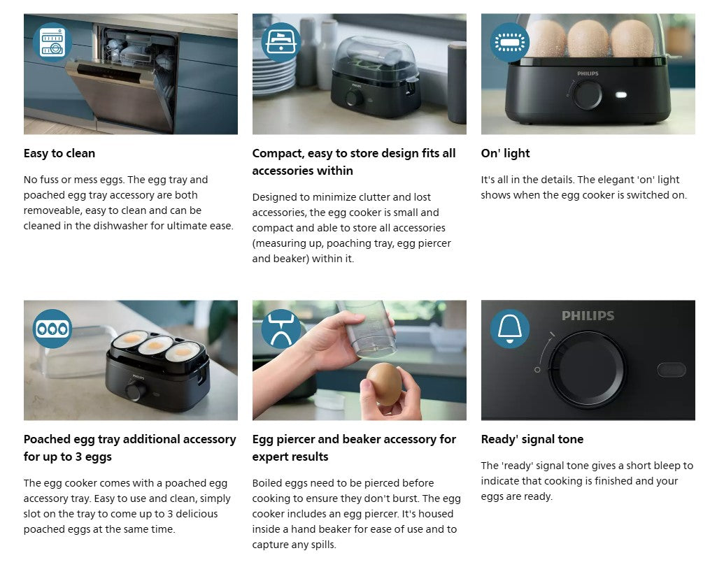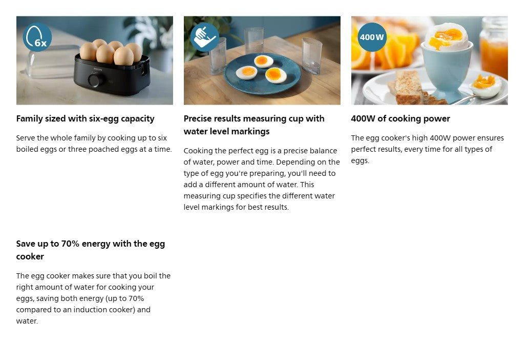 Eggs cooked the way you enjoy them. Soft, medium, hard boiled and poached eggs cooked to perfection. With enough capacity for the whole family, its compact, practical design is also easy to clean and doesn't take up much space.