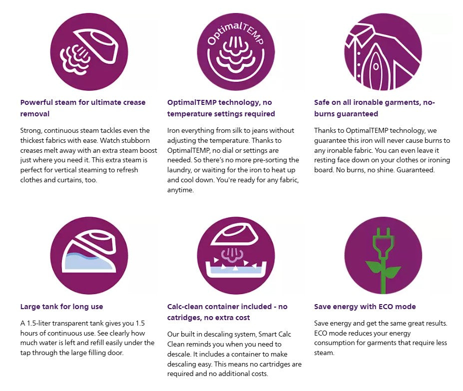 Powerful, continuous steam makes fast work of all your ironing - without any need to adjust temperature thanks to our OptimalTEMP technology. Compact and lightweight for easy use and storage.