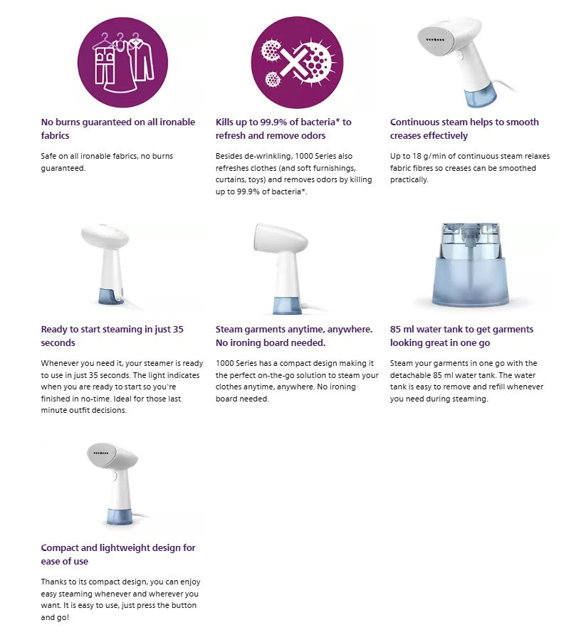Enjoy effortless and quick steaming with our Handheld Steamer 1000 Series. With its lightweight and compact design, perfecting your look has never been easier- making it your ultimate styling companion. Just plug in and you're ready to go!