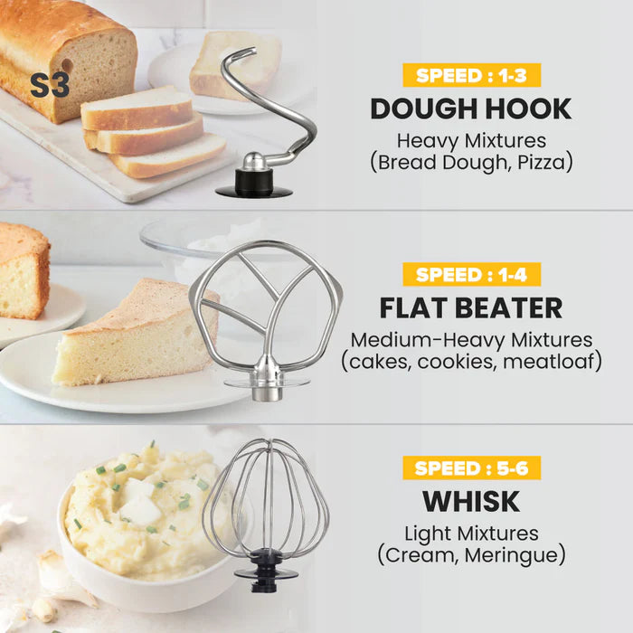 - High Quality - The extra pulse setting allows for intermittent mixing. Our Stand Mixer comes with 3 attachments that allow you to do a variety of cooking techniques at great ease and convenience. The durable dough hooks make mixing dough and heavier cake mixes easy. The beater is perfect for whisking egg whites, creaming ingredients and for light cake mixtures or batters, whilst ensuring nothing sticks to the bowl.