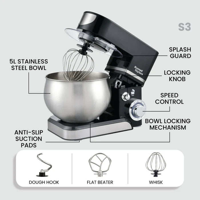- Baking With Russell Taylors - This powerful 1300W stand mixer capable of mixing up to 1kg of flour in its large 5L stainless steel bowl.