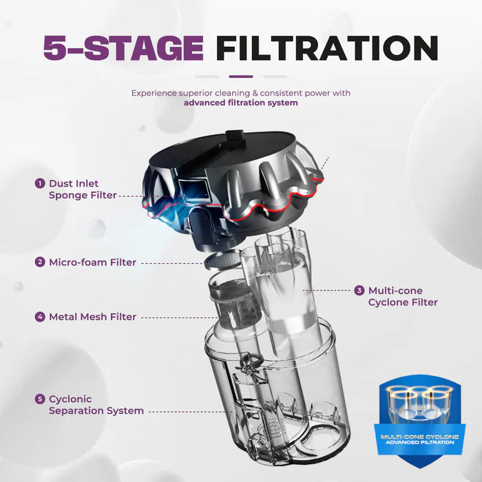 - An enlarged capacity from our dual-cup design means you will not have to empty the dust cup as often. The fully sealed cyclone filtration system traps 99.9% of particles as small as 0.3 microns.
