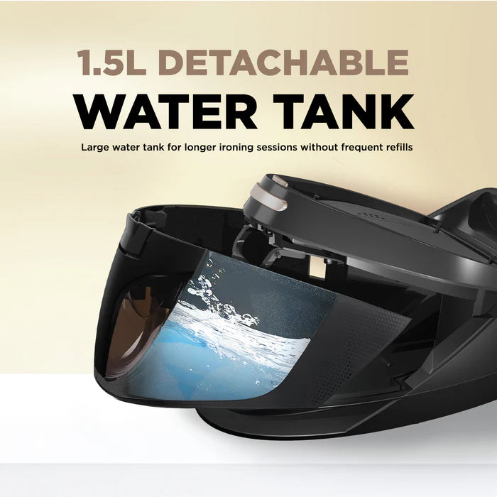 - The steam generator features a locking mechanism that secures the iron to the base, allowing for easily transportation. Both the iron and base wire can be stored together in the designated slot for ease of storage.