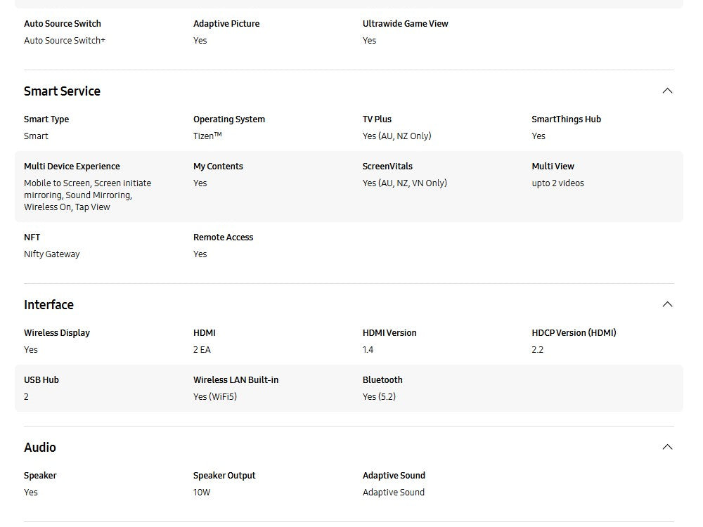 ● Multi Device Experience Mobile to Screen, Screen initiate mirroring, Sound Mirroring, Wireless On, Tap View