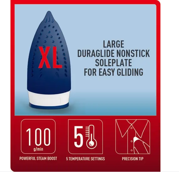 - Easy Glide: XL Duraglide soleplate for smooth ironing.