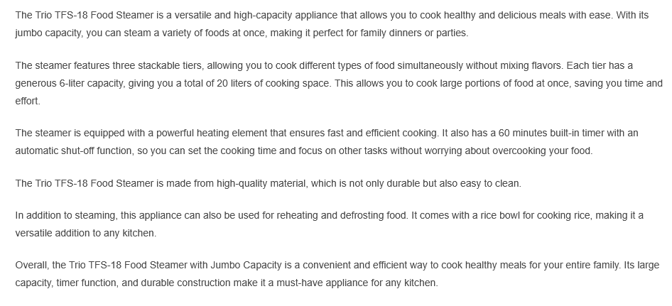 Trio 20L Food Steamer with Jumbo Capacity TFS-18/TFS18